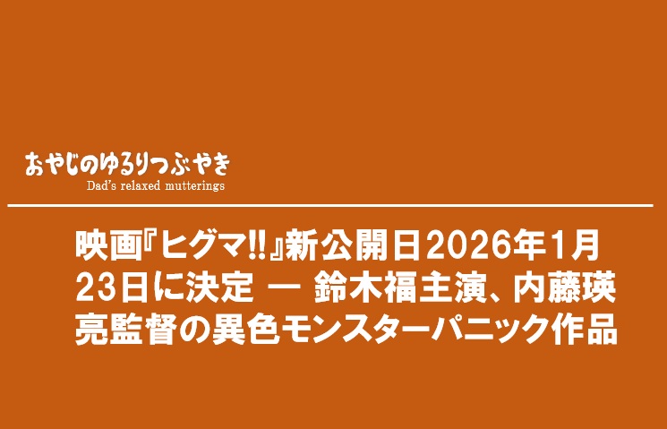 公開延期となっていた鈴木福主演、内藤瑛亮監督による映画『ヒグマ!!』の新たな公開日が**2026年1月23日(金)**に決定しました。本作は「使い捨て闇バイトVS最強ヒグマ」という異色の題材で、邦画史上屈指のスリルとスケールで描かれるモンスターパニックアドベンチャーバトル作品です。
