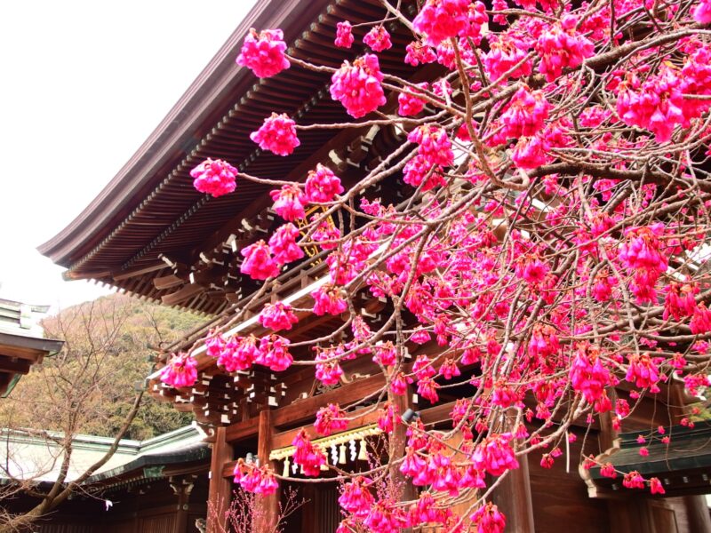 宮地嶽神社の楼門前では、2月頃に緋寒桜が満開になります。朱色の楼門と鮮やかな桜の対比は美しく、春の訪れを感じさせてくれます。