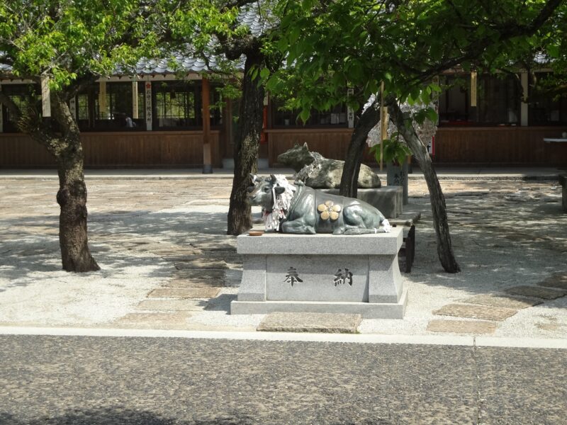 天満宮と牛の関係はよく知られていますが、その由来は、道真が牛と深い縁を持っていたという伝承にあります。道真が亡くなった際、牛が座り込んで動かなくなった場所に葬られた、という話は有名です。そこから、牛は道真の御神使とされ、天満宮では欠かせない存在となりました。