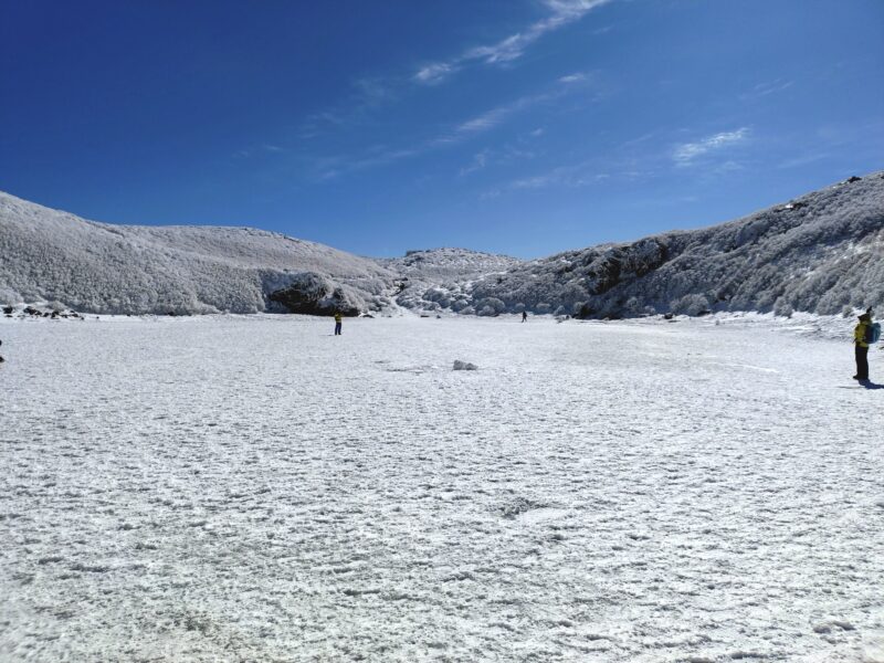 雪に覆われた久住の景色と凍った湖は、他の季節とはまったく違う幻想的な風景を見せてくれます。 冬の久住は厳しい環境になりますが、その分だけ特別な景色に出会うことができます。