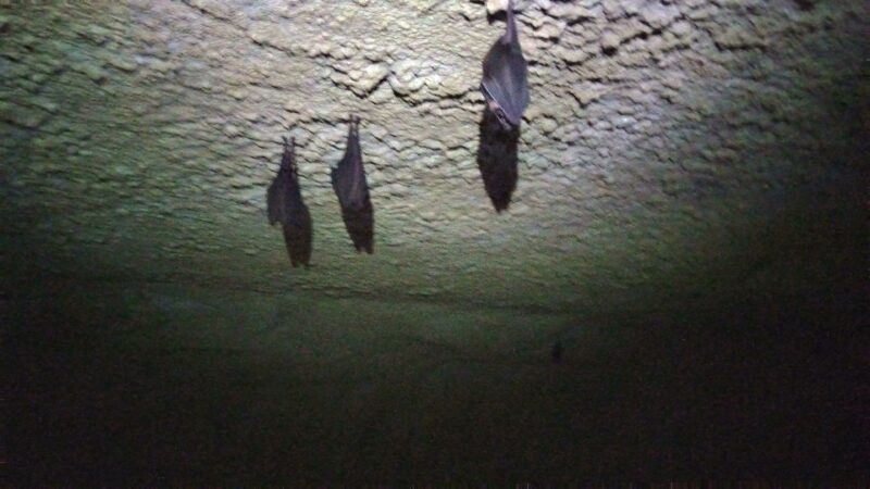 すすむにつれて天井が低くなってゆきます。低い天井には、コオモリがさかさまにぶら下がっています。3月のコオモリは冬眠中で体が弱っているので、起こさないように気を付けて進みます。